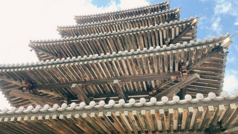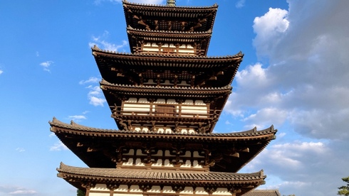 法隆寺の建造物で使われている木材は「檜」であり非常に強度が高いと言われ、また保存性が高い樹種だ。杉の木は約500年で強度がピークなのに対して「檜」は1000年が経過してもなお強度がそれほど変わらないと言われている。法隆寺五重塔は、高さ約32m、勿論ヒノキが使われ「積み上げ方式」と言われる建築様式だ。薬師寺もそうだが 塔の真ん中に一本の柱があり、これは各階とは接合されず分離されており、各階は単純に重ねてある構造。 地震の際は、各階が互い違いに揺れ、振動を吸収する免振構造になっている。